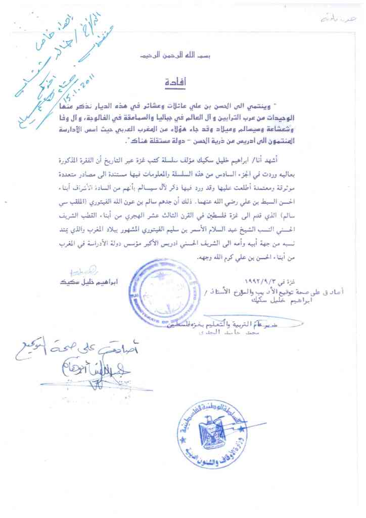 "و ينتمي الي الحسن بن علي عائلات و عشائر في هذة الديار منها الوحيدات من عرب الترابين و آل العالم في جباليا و السمامقة بالفالوجا و آل وفا و شعشاعه و سيسالم و ميلاد و قد جاء هؤلاء من المغرب العربي حيث أسس الأدارسة المنتمون إلى إدريس من ذرية الحسن دولة مستقلة".